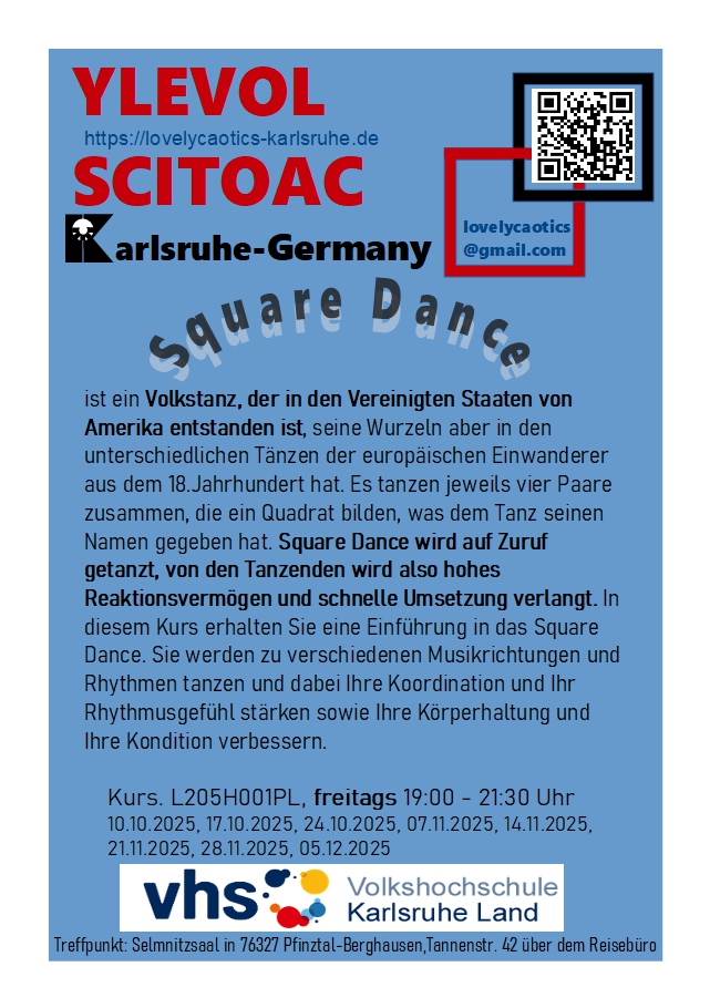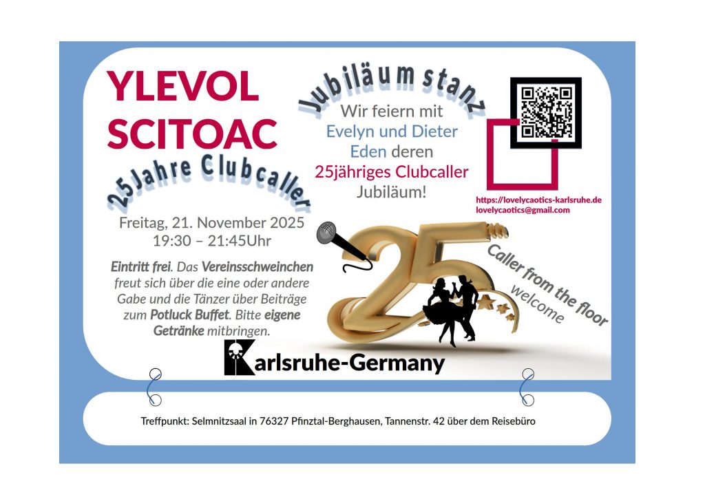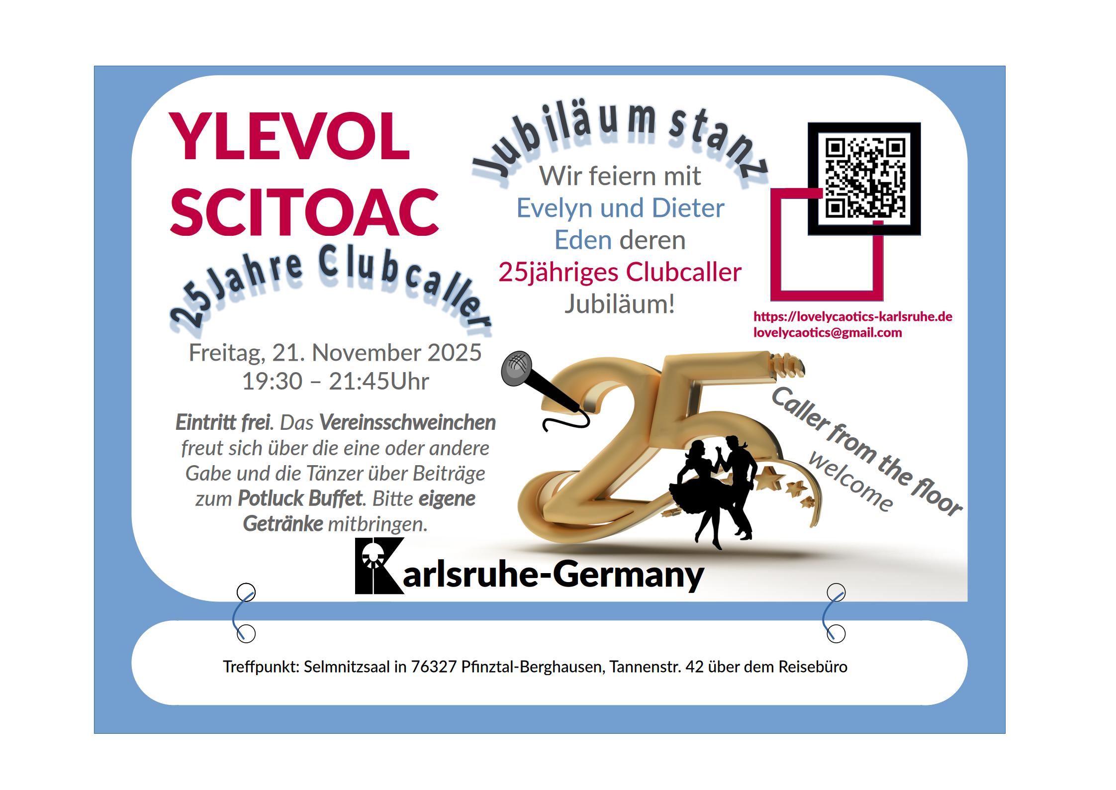 Wir tanzen auch am Freitag, den 3.Oktober! Nächster Einsteigerkurs im Herbst: Termine & Events Open House im Oktober: Open House 21.9.2025 wir sind beim Karlsruher Marathon mit anderen Karlsruhern Square Dance Vereinen dabei. Wer mittanzen möchte oder zuschauen möchte, kann uns gerne wegen genauer Uhrzeit und Ort kontaktieren. 21.11.2015: 25jähriges Clubcaller Jubiläum Evelyn und Dieter Eden – Details folgen noch |