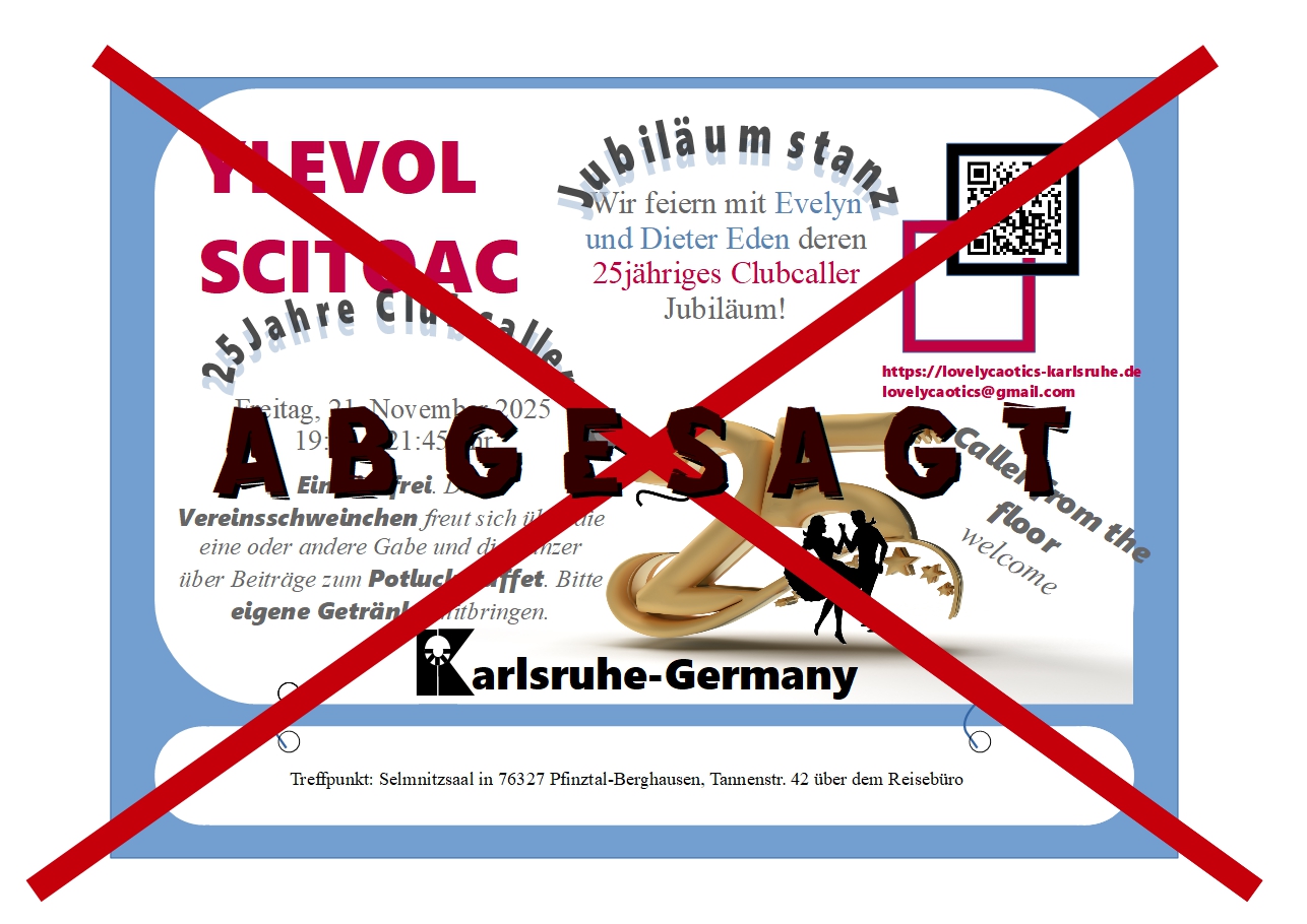 | 21.11.2025: Die Special Club Night zum 25jährigen Clubcaller Jubiläum von Evelyn und Dieter Eden findet nicht statt! |